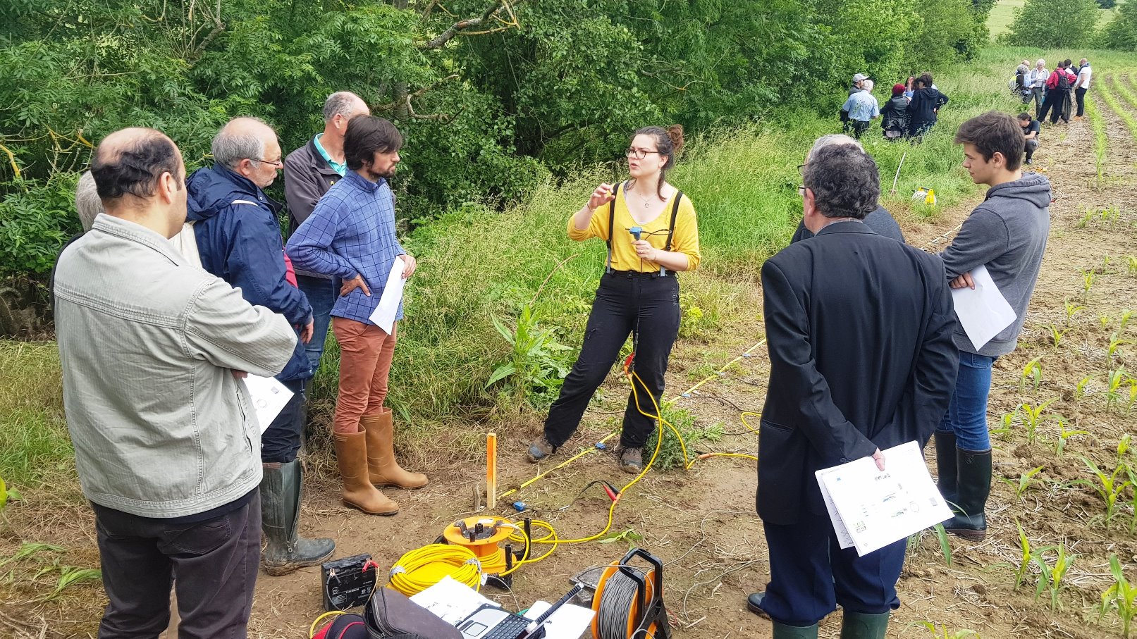 Plusieurs ateliers de découverte des instruments de mesure utilisés par les scientifiques ont été menés lors de la matinée sur le terrain de la ferme de La Derrier, afin de sensibiliser à la complexité du travail effectué sur le terrain par les chercheurs, mais également de présenter la multiplicité des approches opérées par les équipes du PIREN-Seine : Hydrologique, biogéochimique, géophysique, etc.