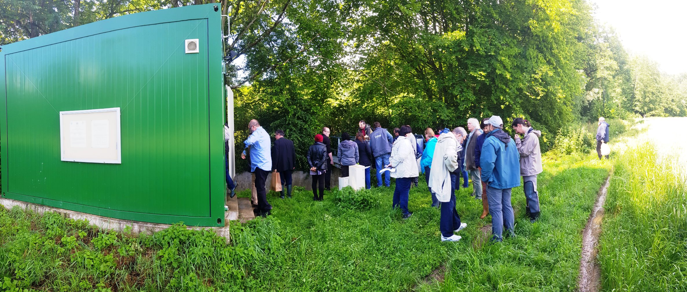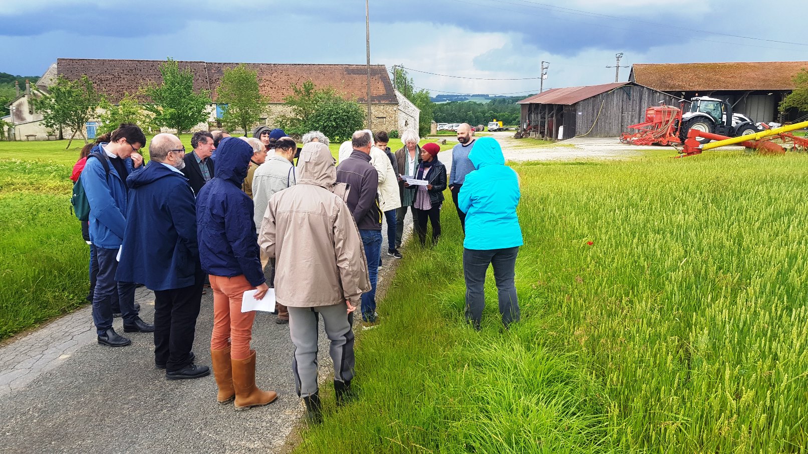 Après un déjeuner à la Mairie d'Aulnoy, l’après-midi de cette journée fut consacrée à la visite de deux sites incontournables du bassin de l’Orgeval. La première fut l’exploitation agricole biologique d’Eric Gobard, maire d’Aulnoy et partenaire historique des chercheurs du PIREN-Seine dans leur suivi des pratiques agricoles. Au programme : découverte des espèces végétales cultivées, rendement et qualité des produits, et filières de débouché des cultures fixatrices d’azote non consommables telles que la luzerne. Et évidemment, dégustation de biscuits biologiques de la ferme ! Quant au deuxième site visité de l'après-midi, ce fut celui du River Lab, installation scientifiques d’IRSTEA qui permet le suivi en continue du ru des Avenelles : chimie de l’eau, température, débitmètrie, ou encore contamination aux pesticides.
