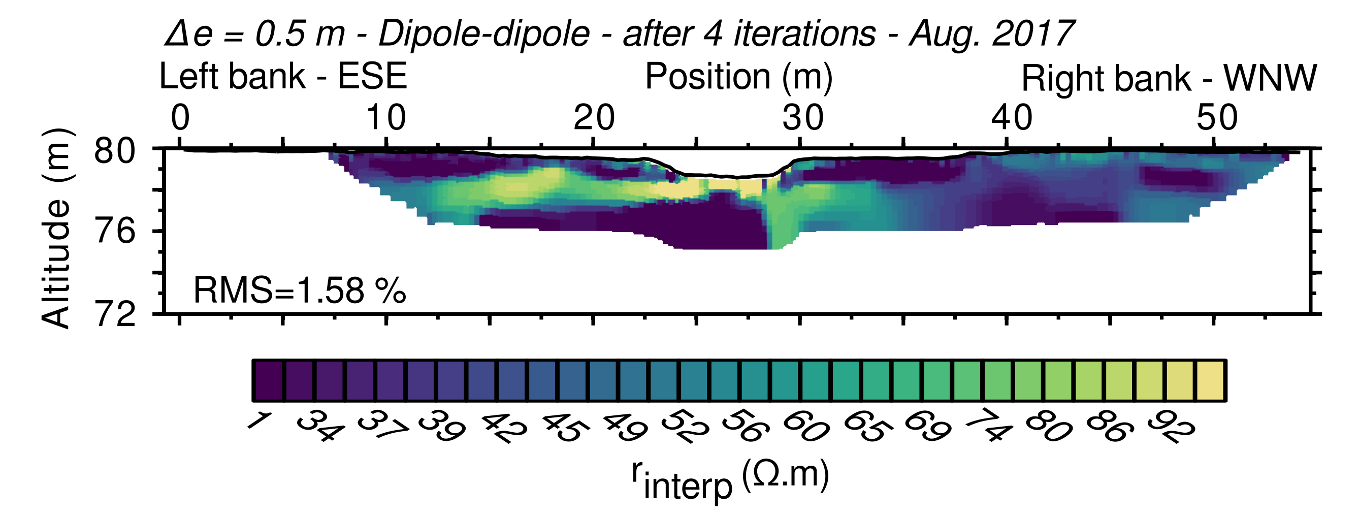 La coupe obtenue par les expériences de résistivité électrique, qui montrent là aussi une hétérogénéité de faciès marquée du milieu sur la berge gauche.