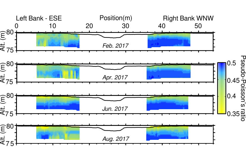 Les « coupes » obtenues par la méthode sismique, à deux mois d’intervalle. Le coefficient de poisson est un indicateur de la saturation en eau du sol : plus sa valeur est proche de 0,5 (tons bleus), plus le sol est supposé être saturé en eau.