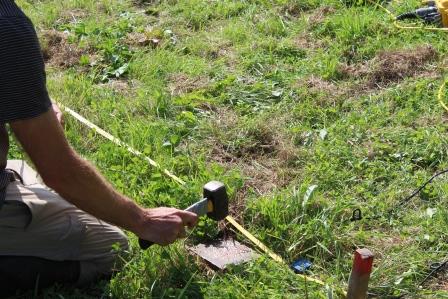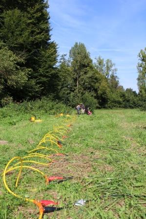 Le principe de cette méthode est d’installer des capteurs sismiques en ligne droite, perpendiculairement eu Ru des Avenelles, et d’émettre un choc en percutant au marteau une plaque de métal posée à même le sol à intervalles réguliers. Des ondes sismiques générées par ce choc se propagent alors dans le milieu, et sont ensuite enregistrées par les différents capteurs. Selon les caractéristiques du milieu traversé, les ondes vont atteindre les capteurs avec un certain angle et une certaine vitesse, et vont pouvoir indiquer la saturation en eau du sol, et ainsi permettre de mieux comprendre l’état hydrogéologique du milieu à plusieurs mètres de profondeur. Pour obtenir un résultat complet, l’expérience est reproduite un grand nombre de fois, tous les 25 cm, sur une longueur de 25 mètres de chaque côté de la rivière.