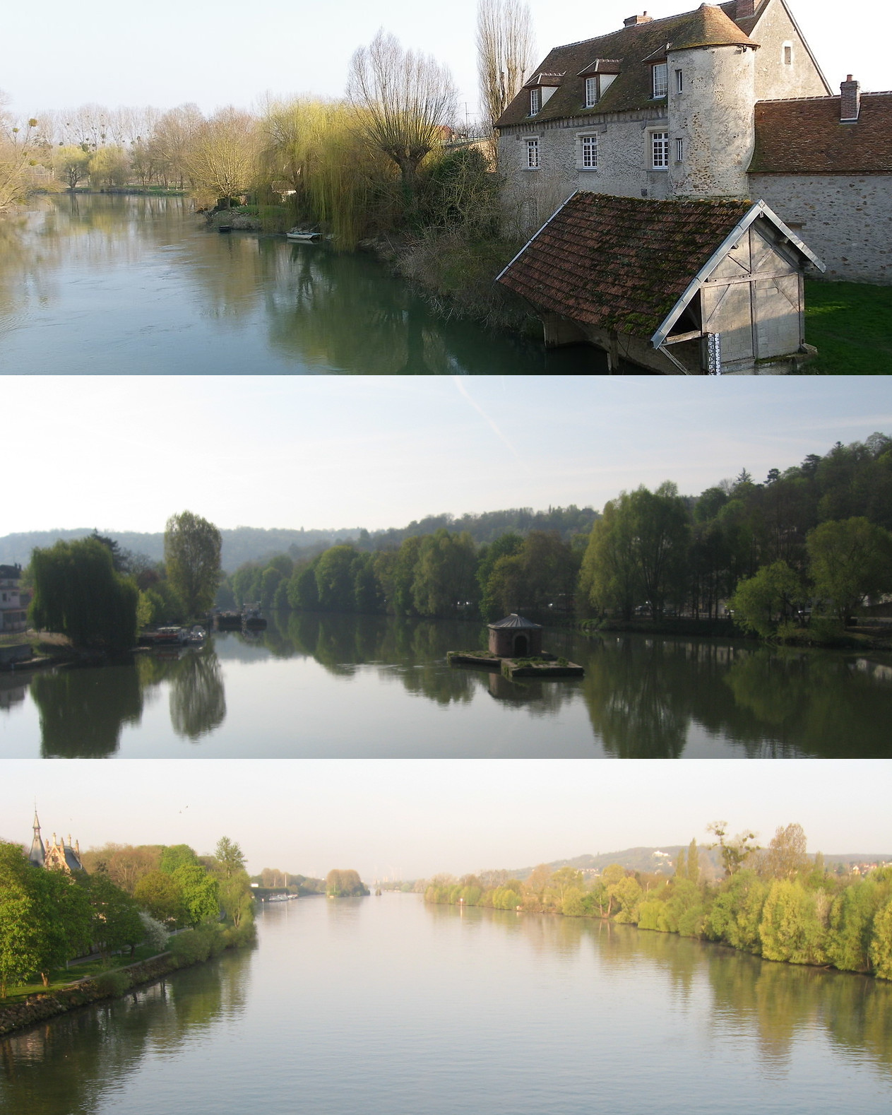La Seine elle-même, et particulièrement son passage par l’agglomération parisienne, est suivie par les scientifiques en plusieurs points stratégiques. Les sites de Marnay-sur-Seine (amont - en haut ci-contre), Bougival (aval de Paris, au milieu ci-contre) et Triel-sur-Seine (confluence Oise - en bas ci-contre) sont particulièrement utilisés pour les mesures de transfert de contaminant, le prélèvement de microplastiques ou le suivi de la matière organique. De nombreux autres points de prélèvement sont cependant utilisés, allant des têtes de bassin au barrage de Poses.