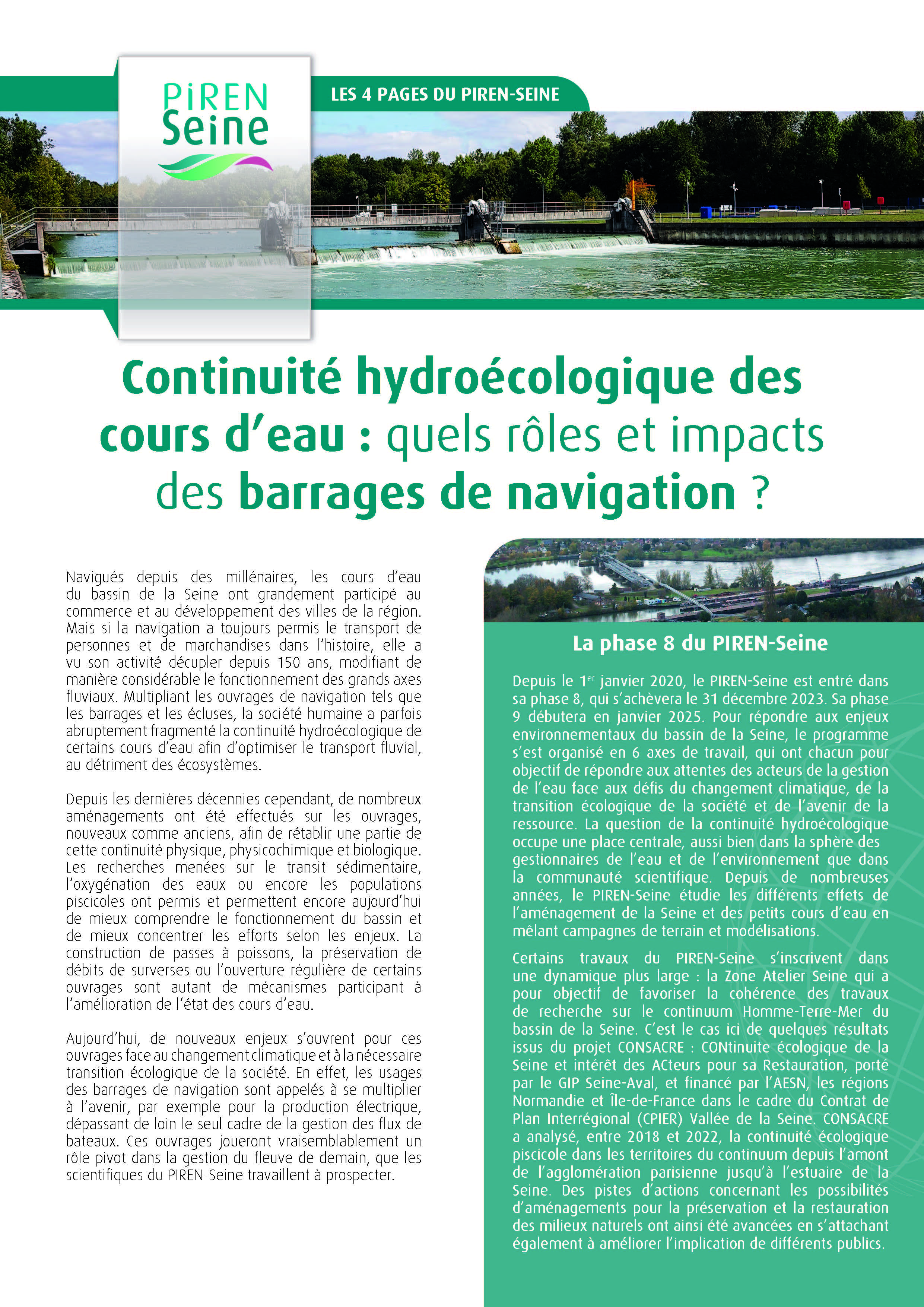 Aujourd’hui, de nouveaux enjeux s’ouvrent pour ces ouvrages face au changement climatique et à la nécessaire transition écologique de la société. En effet, les usages des barrages de navigation sont appelés à se multiplier à l’avenir, par exemple pour la production électrique, dépassant de loin le seul cadre de la gestion des flux de bateaux. Ces ouvrages joueront vraisemblablement un rôle pivot dans la gestion du fleuve de demain, que les scientifiques du PIREN-Seine travaillent à prospecter.