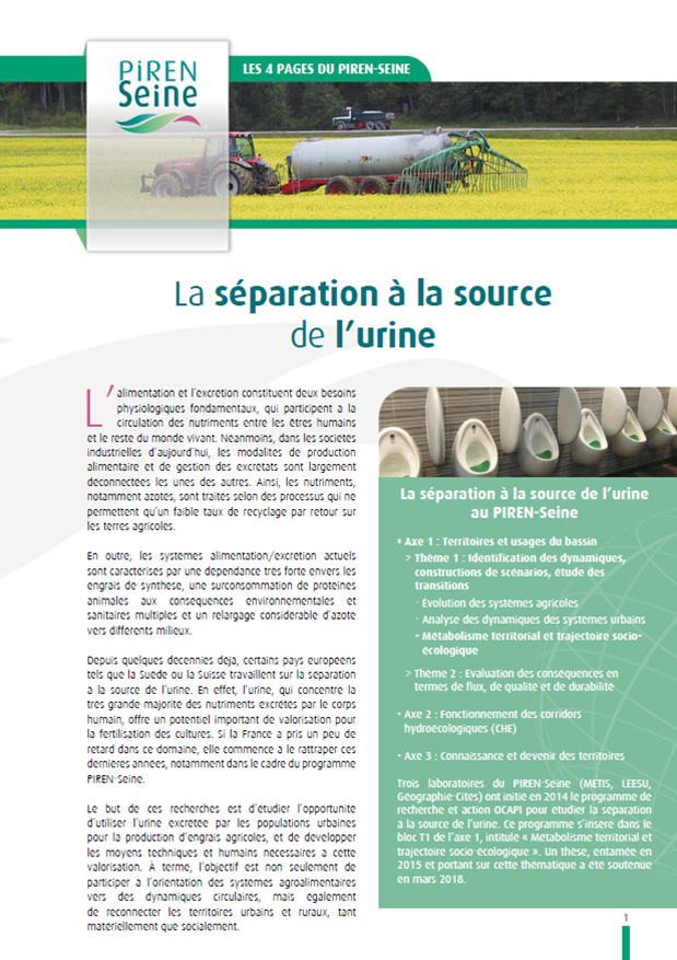 Depuis 2015, le PIREN-Seine étudie l’opportunité d’utiliser l’urine excrétée par les populations urbaines pour la production d’engrais agricoles, et de développer les moyens techniques et humains nécessaires à cette valorisation. Faisant l'objet d'une thèse soutenue en 2018, la séparation à la source de l'urine est aujourd'hui un domaine de recherche innovant, qui fait l'objet d'un programme spécifique, le programme OCAPI.