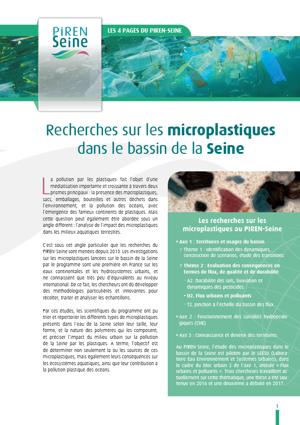 Le PIREN-Seine mène depuis 2013 des recherches sur les microplastiques présents dans les différents compartiments du milieu urbain. Premières recherches de ce type effectuées en France, celles-ci permettent de dresser un premier bilan de la contamination en microplastiques de l'agglomération parisienne, et ouvre de nouveaux champs à explorer, tels que la contribution des microplastiques à l'estuaire, ou leur passage dans la chaîne trophique.