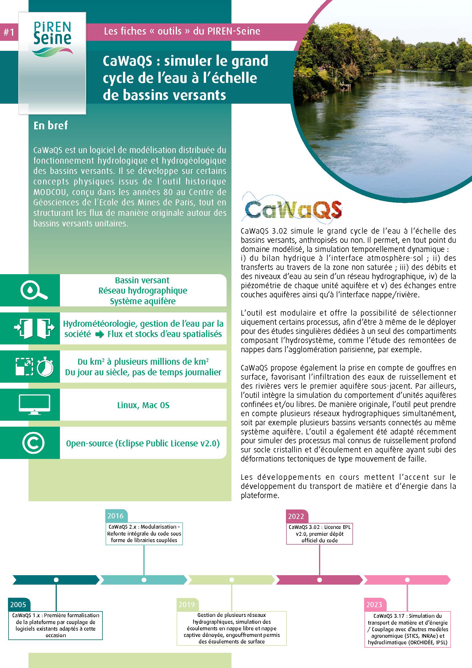 Développée par les Mines Paris - PSL, CaWaQS (Catchment Water Quality Simulator) est une plateforme de modélisation distribuée du fonctionnement hydrologique et hydrogéologique d’un territoire. Elle permet de simuler les flux souterrains et de surface d’un hydrosystème allant du petit bassin versant à l’échelle régionale, et a la particularité de simuler les échanges nappe-rivière.