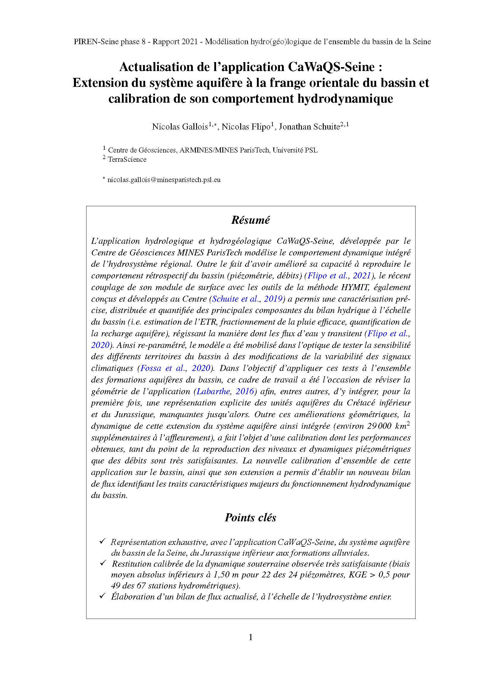 L’application hydrologique et hydrogéologique CaWaQS-Seine, développée par le Centre de Géosciences MINES ParisTech modélise le comportement dynamique intégré de l’hydrosystème régional. Outre le fait d’avoir amélioré sa capacité à reproduire le comportement rétrospectif du bassin (piézométrie, débits) (Flipo et al., 2021), le récent couplage de son module de surface avec les outils de la méthode HYMIT, également conçus et développés au Centre (Schuite et al., 2019) a permis une caractérisation précise, distribuée et quantifiée des principales composantes du bilan hydrique à l’échelle du bassin (i.e. estimation de l’ETR, fractionnement de la pluie efficace, quantification de la recharge aquifère), régissant la manière dont les flux d’eau y transitent (Flipo et al., 2020). Ainsi re-paramétré, le modèle a été mobilisé dans l’optique de tester la sensibilité des différents territoires du bassin à des modifications de la variabilité des signaux climatiques (Fossa et al., 2020). Dans l’objectif d’appliquer ces tests à l’ensemble des formations aquifères du bassin, ce cadre de travail a été l’occasion de réviser la géométrie de l’application (Labarthe, 2016) afin, entres autres, d’y intégrer, pour la première fois, une représentation explicite des unités aquifères du Crétacé inférieur et du Jurassique, manquantes jusqu’alors. Outre ces améliorations géométriques, la dynamique de cette extension du système aquifère ainsi intégrée (environ 29 000 𝑘𝑚2 supplémentaires à l’affleurement), a fait l’objet d’une calibration dont les performances obtenues, tant du point de la reproduction des niveaux et dynamiques piézométriques que des débits sont très satisfaisantes. La nouvelle calibration d’ensemble de cette application sur le bassin, ainsi que son extension a permis d’établir un nouveau bilan de flux identifiant les traits caractéristiques majeurs du fonctionnement hydrodynamique du bassin.