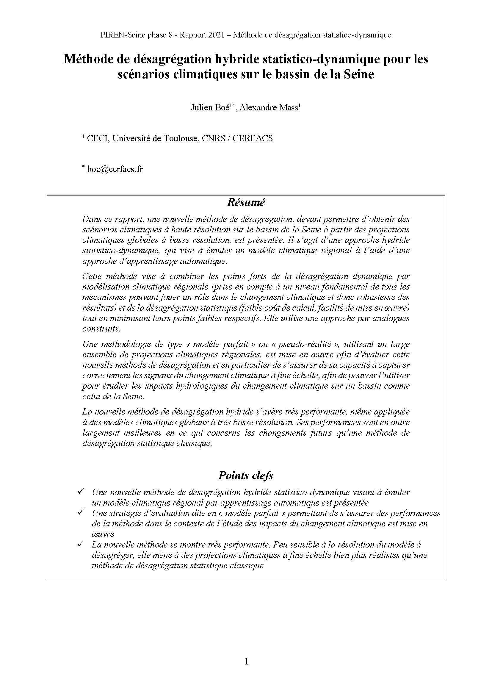 Dans ce rapport, une nouvelle méthode de désagrégation, devant permettre d’obtenir des scénarios climatiques à haute résolution sur le bassin de la Seine à partir des projections climatiques globales à basse résolution, est présentée. Il s’agit d’une approche hydride statistico-dynamique, qui vise à émuler un modèle climatique régional à l’aide d’une approche d’apprentissage automatique.