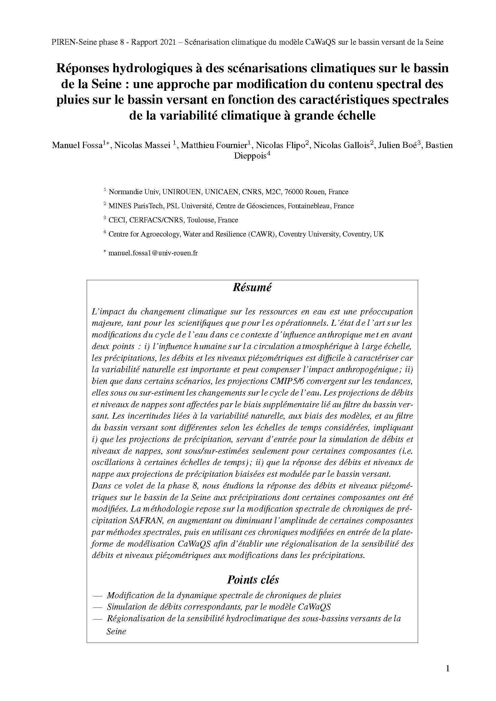 L’impact du changement climatique sur les ressources en eau est une préoccupation majeure, tant pour les scientifiques que pour l es opérationnels. L’état de l ’art s ur les modifications du cycle de l’eau dans ce contexte d’influence anthropique met en avant deux points : i) l’influence h umaine s ur l a c irculation a tmosphérique à l arge échelle, les précipitations, les débits et les niveaux piézométriques est difficile à caractériser car la variabilité naturelle est importante et peut compenser l’impact anthropogénique ; ii) bien que dans certains scénarios, les projections CMIP5/6 convergent sur les tendances, elles sous ou sur-estiment les changements sur le cycle de l’eau. Les projections de débits et niveaux de nappes sont affectées par le biais supplémentaire lié au filtre du bassin versant. Les incertitudes liées à la variabilité naturelle, aux biais des modèles, et au filtre du bassin versant sont différentes selon les échelles de temps considérées, impliquant i) que les projections de précipitation, servant d’entrée pour la simulation de débits et niveaux de nappes, sont sous/sur-estimées seulement pour certaines composantes (i.e. oscillations à certaines échelles de temps) ; ii) que la réponse des débits et niveaux de nappe aux projections de précipitation biaisées est modulée par le bassin versant. Dans ce volet de la phase 8, nous étudions la réponse des débits et niveaux piézométriques sur le bassin de la Seine aux précipitations dont certaines composantes ont été modifiées. La méthodologie repose sur la modification spectrale de chroniques de précipitation SAFRAN, en augmentant ou diminuant l’amplitude de certaines composantes par méthodes spectrales, puis en utilisant ces chroniques modifiées en entrée de la plateforme de modélisation CaWaQS afin d’établir une régionalisation de la sensibilité des débits et niveaux piézométriques aux modifications dans les précipitations.