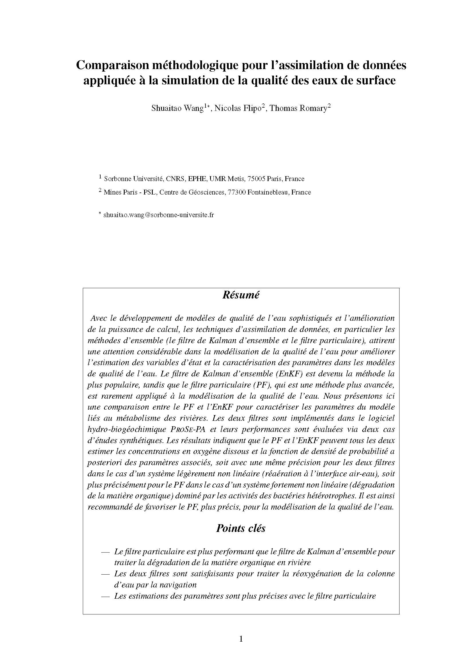 Avec le développement de modèles de qualité de l’eau sophistiqués et l’amélioration de la puissance de calcul, les techniques d’assimilation de données, en particulier les méthodes d’ensemble (le filtre de Kalman d’ensemble et le filtre particulaire), attirent une attention considérable dans la modélisation de la qualité de l’eau pour améliorer l’estimation des variables d’état et la caractérisation des paramètres dans les modèles de qualité de l’eau. Le filtre de Kalman d’ensemble (EnKF) est devenu la méthode la plus populaire, tandis que le filtre particulaire (PF), qui est une méthode plus avancée, est rarement appliqué à la modélisation de la qualité de l’eau. Nous présentons ici une comparaison entre le PF et l’EnKF pour caractériser les paramètres du modèle liés au métabolisme des rivières. Les deux filtres sont implémentés dans le logiciel hydro-biogéochimique ProSe-PA et leurs performances sont évaluées via deux cas d’études synthétiques. Les résultats indiquent que le PF et l’EnKF peuvent tous les deux estimer les concentrations en oxygène dissous et la fonction de densité de probabilité a posteriori des paramètres associés, soit avec une même précision pour les deux filtres dans le cas d’un système légèrement non linéaire (réaération à l’interface air-eau), soit plus précisément pour le PF dans le cas d’un système fortement non linéaire (dégradation de la matière organique) dominé par les activités des bactéries hétérotrophes. Il est ainsi recommandé de favoriser le PF, plus précis, pour la modélisation de la qualité de l’eau.