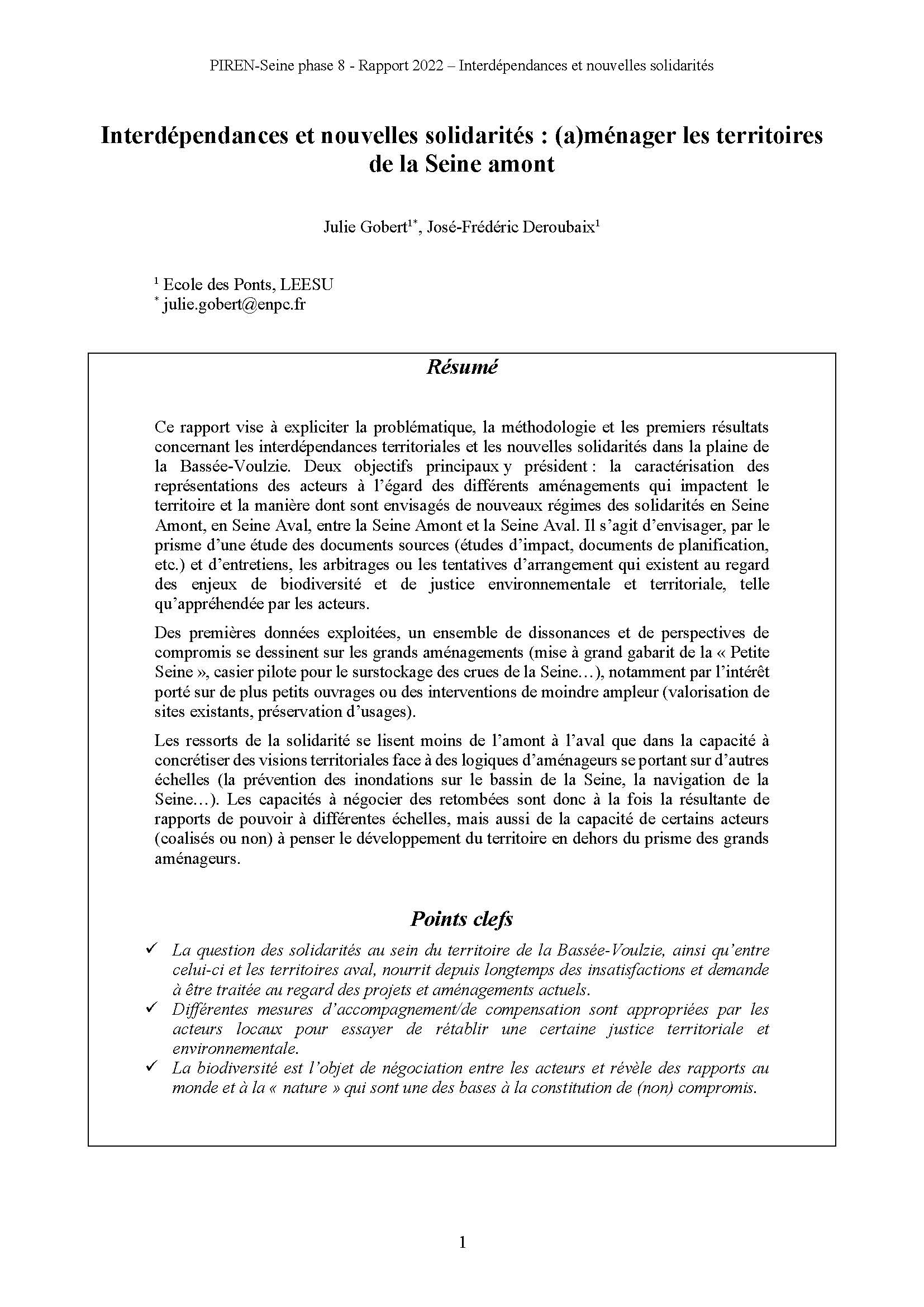 Ce rapport vise à expliciter la problématique, la méthodologie et les premiers résultats concernant les interdépendances territoriales et les nouvelles solidarités dans la plaine de la Bassée-Voulzie. Deux objectifs principaux y président : la caractérisation des représentations des acteurs à l’égard des différents aménagements qui impactent le territoire et la manière dont sont envisagés de nouveaux régimes des solidarités en Seine Amont, en Seine Aval, entre la Seine Amont et la Seine Aval. Il s’agit d’envisager, par le prisme d’une étude des documents sources (études d’impact, documents de planification, etc.) et d’entretiens, les arbitrages ou les tentatives d’arrangement qui existent au regard des enjeux de biodiversité et de justice environnementale et territoriale, telle qu’appréhendée par les acteurs.