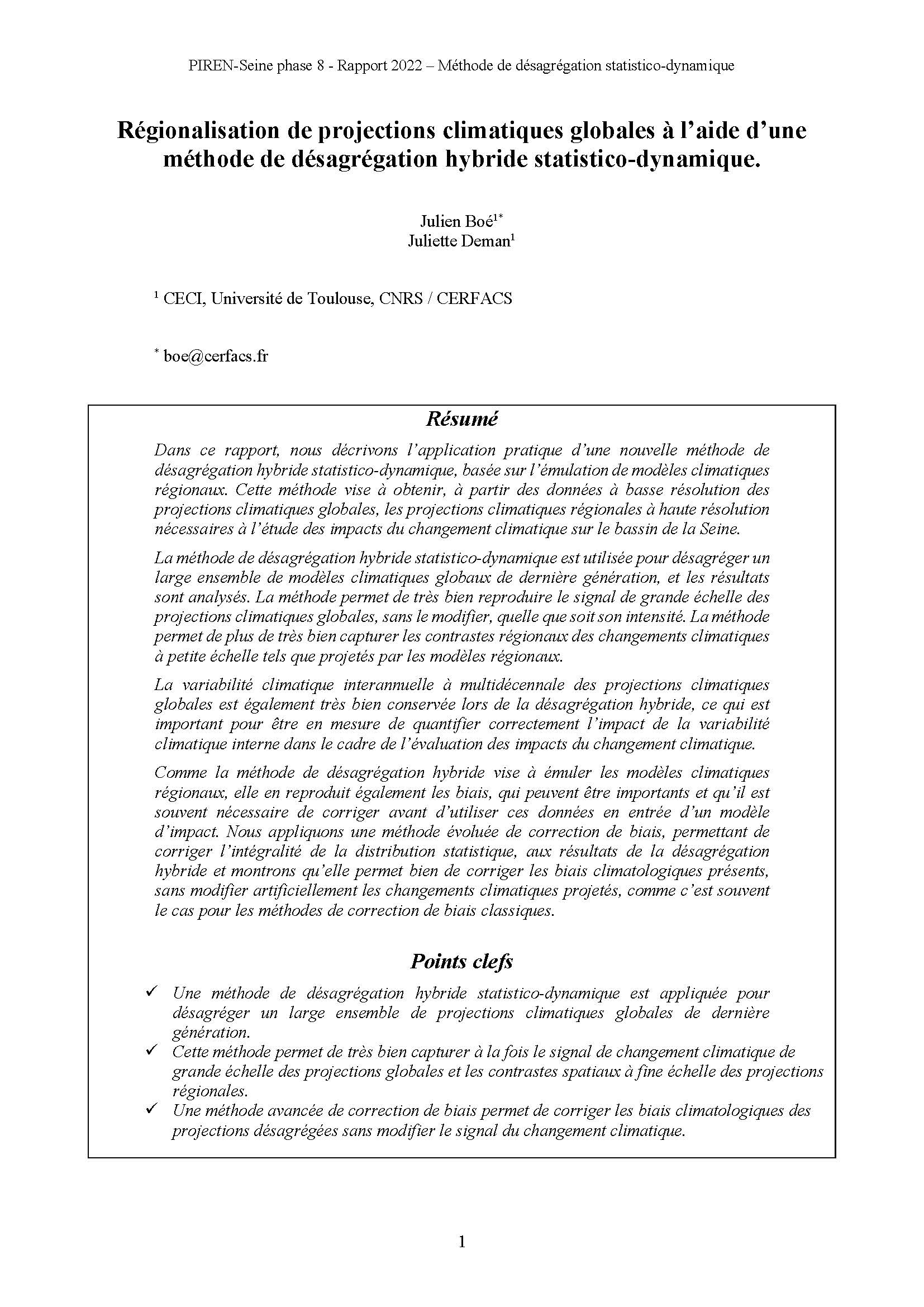 Dans ce rapport, nous décrivons l’application pratique d’une nouvelle méthode de désagrégation hybride statistico-dynamique, basée sur l’émulation de modèles climatiques régionaux. Cette méthode vise à obtenir, à partir des données à basse résolution des projections climatiques globales, les projections climatiques régionales à haute résolution nécessaires à l’étude des impacts du changement climatique sur le bassin de la Seine.