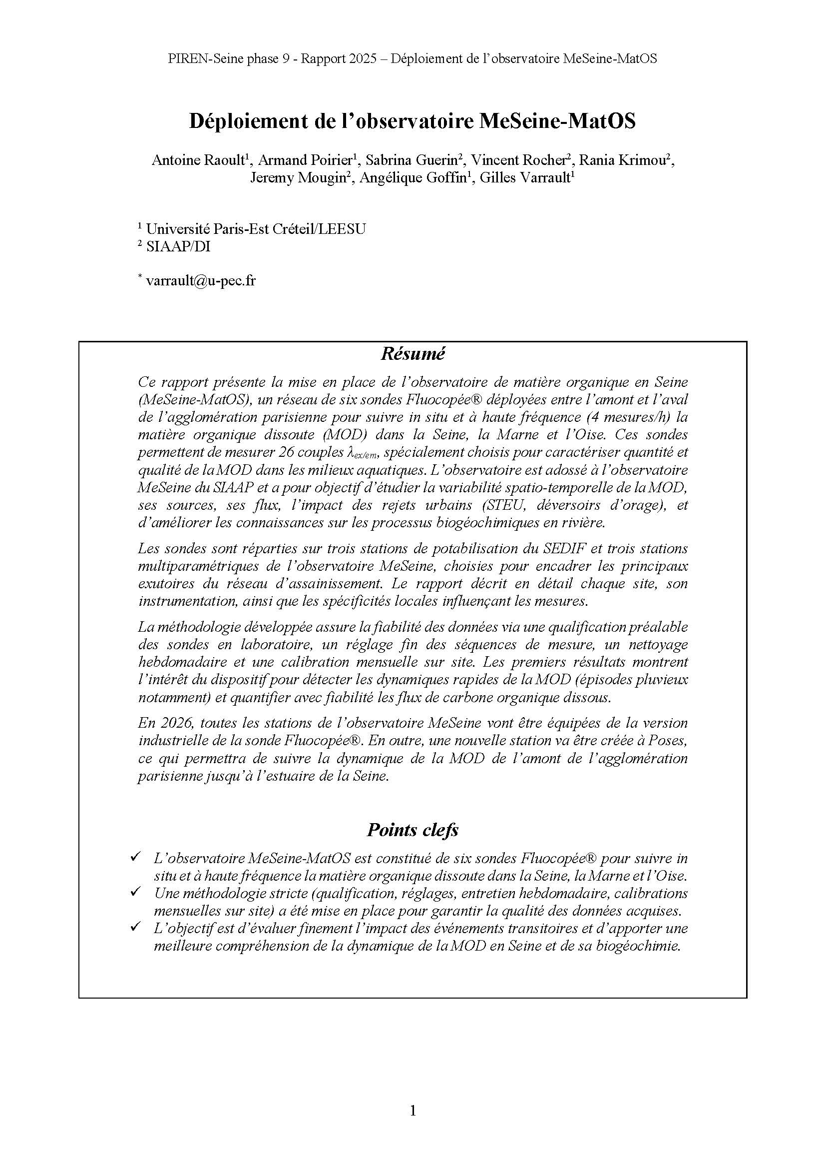 Ce rapport présente la mise en place de l’observatoire de matière organique en Seine (MeSeine-MatOS), un réseau de six sondes Fluocopée® déployées entre l’amont et l’aval de l’agglomération parisienne pour suivre in situ et à haute fréquence (4 mesures/h) la matière organique dissoute (MOD) dans la Seine, la Marne et l’Oise. Ces sondes permettent de mesurer 26 couples λex/em, spécialement choisis pour caractériser quantité et qualité de la MOD dans les milieux aquatiques. L’observatoire est adossé à l’observatoire MeSeine du SIAAP et a pour objectif d’étudier la variabilité spatio-temporelle de la MOD, ses sources, ses flux, l’impact des rejets urbains (STEU, déversoirs d’orage), et d’améliorer les connaissances sur les processus biogéochimiques en rivière.
