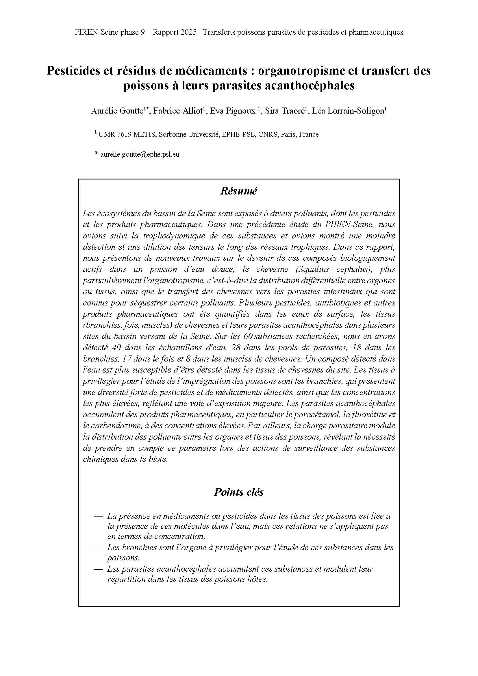 Les écosystèmes du bassin de la Seine sont exposés à divers polluants, dont les pesticides et les produits pharmaceutiques. Dans une précédente étude du PIREN-Seine, nous avions suivi la trophodynamique de ces substances et avions montré une moindre détection et une dilution des teneurs le long des réseaux trophiques. Dans ce rapport, nous présentons de nouveaux travaux sur le devenir de ces composés biologiquement actifs dans un poisson d’eau douce, le chevesne (Squalius cephalus), plus particulièrement l'organotropisme, c’est-à-dire la distribution différentielle entre organes ou tissus, ainsi que le transfert des chevesnes vers les parasites intestinaux qui sont connus pour séquestrer certains polluants. Plusieurs pesticides, antibiotiques et autres produits pharmaceutiques ont été quantifiés dans les eaux de surface, les tissus (branchies, foie, muscles) de chevesnes et leurs parasites acanthocéphales dans plusieurs sites du bassin versant de la Seine. Sur les 60 substances recherchées, nous en avons détecté 40 dans les échantillons d'eau, 28 dans les pools de parasites, 18 dans les branchies, 17 dans le foie et 8 dans les muscles de chevesnes. Un composé détecté dans l'eau est plus susceptible d’être détecté dans les tissus de chevesnes du site. Les tissus à privilégier pour l’étude de l’imprégnation des poissons sont les branchies, qui présentent une diversité forte de pesticides et de médicaments détectés, ainsi que les concentrations les plus élevées, reflétant une voie d’exposition majeure. Les parasites acanthocéphales accumulent des produits pharmaceutiques, en particulier le paracétamol, la fluoxétine et le carbendazime, à des concentrations élevées. Par ailleurs, la charge parasitaire module la distribution des polluants entre les organes et tissus des poissons, révélant la nécessité de prendre en compte ce paramètre lors des actions de surveillance des substances chimiques dans le biote.